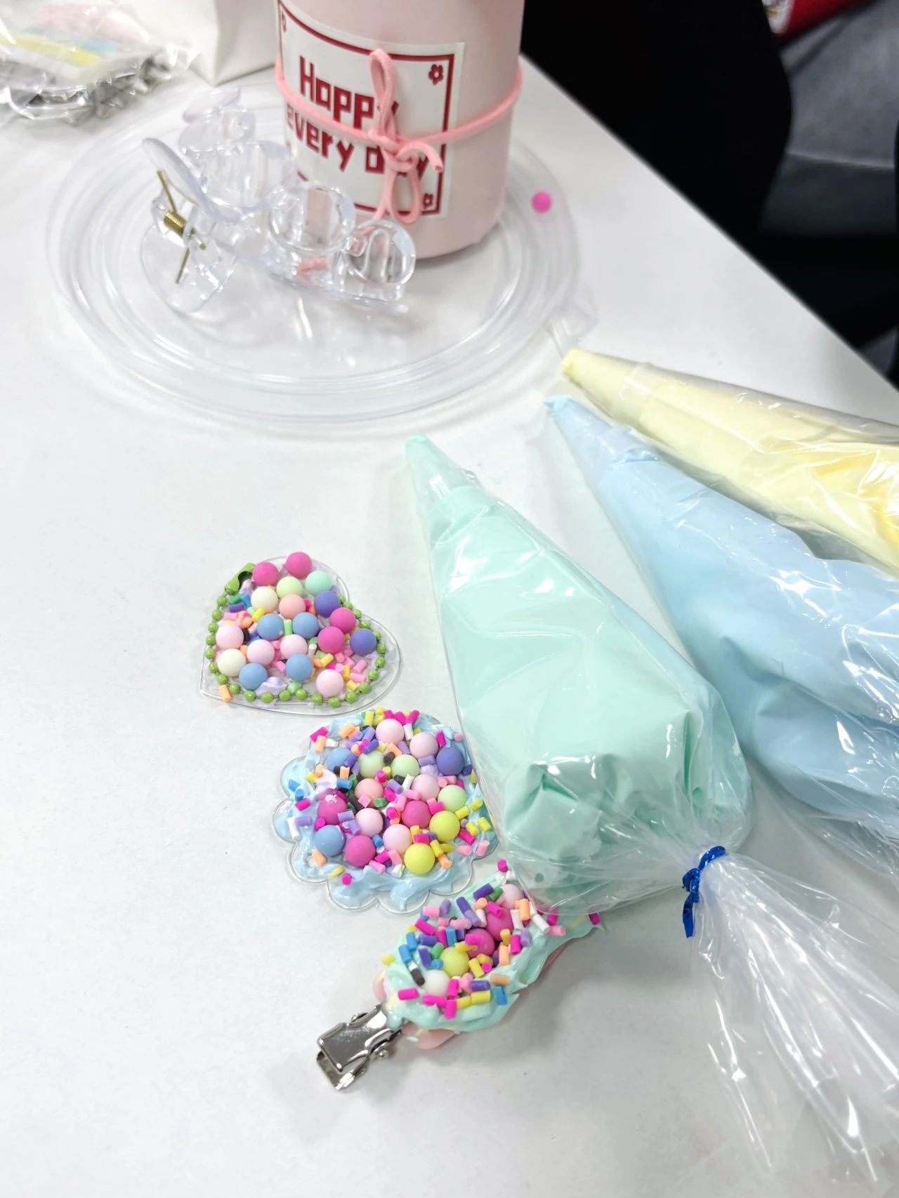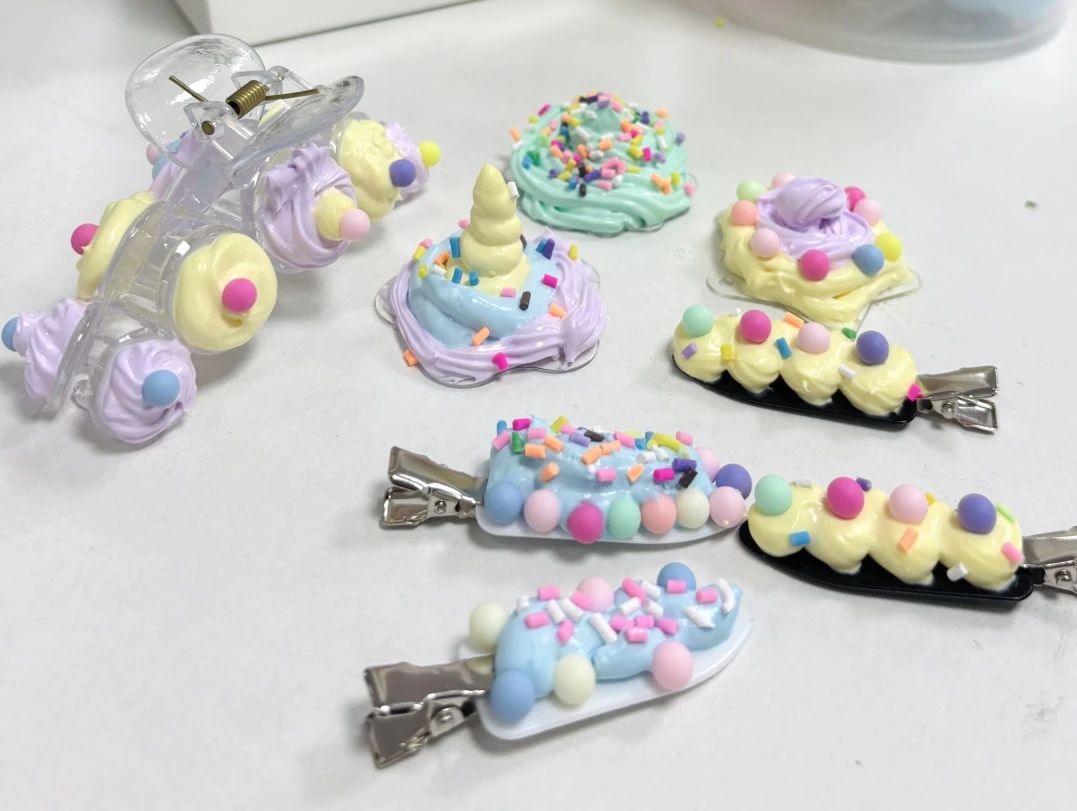 活動(dòng)現(xiàn)場(chǎng)化身為夢(mèng)幻手作樂(lè)園:挺進(jìn)總部會(huì)議室內(nèi)的長(zhǎng)桌上,堆滿(mǎn)糖果色奶油膠與裝飾等元素。大家從擠膠、塑形到點(diǎn)綴裝飾,全情投入創(chuàng)作——有人將發(fā)夾捏成甜甜圈的甜蜜形狀,也有人用星空元素打造銀河系耳畔的浪漫。挺進(jìn)的參與女性員工笑稱(chēng)這場(chǎng)活動(dòng)是"成年人的過(guò)家家"。